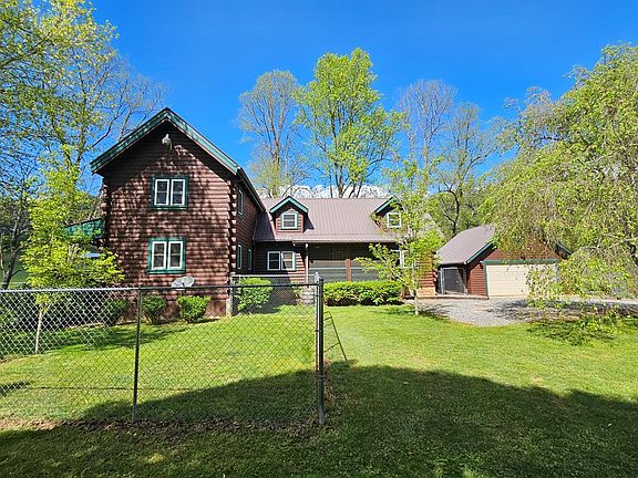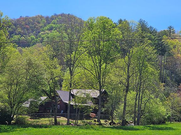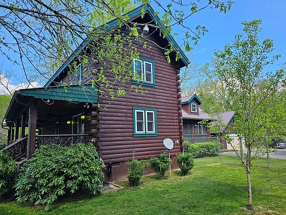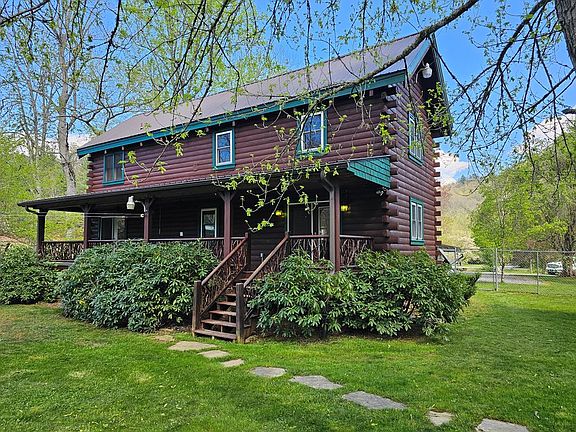 AUTHENTIC "D-LOG" HOME, 3BR/4BA on 1.23 level acres with a magical, bubbling creek bordering one side! This ONCE IN A LIFETIME listing is replete with so many cool amenities to enhance your mountain living experience. 450' of stocked trout stream frontage, viewable from every window & deck on that side of the home! The grounds are level, with a potting shed & greenhouse, 6' chain link fence completely surrounds the home. There are grape vines, Apple, Pear & Peach trees and plenty of room for your garden! This "D-Log" mountain cabin has amazing vaulted & beamed ceilings, a large upper level loft, with a jumbo size bedroom w/ a "dormer" and a bath, a huge activity room, plus a fully equipped Media Room w/Luxury Theatre Seating and killer sound system!! The upper level is cooled and heated via mini-splits and central air cools & heats the loft. The main level has an attractive stone rock gas log fireplace, gorgeous hardwood flooring. The Master/Primary bedroom, and Bedroom #2. along with 3 more baths are on the MAIN level. The master w/ Ensuite has access to the laundry area which is a huge cedar walk-in closet. The kitchen is well appointed adjacent to the deck/stream from the deck