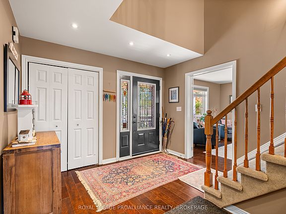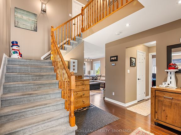 Introducing this beautifully maintained 2-storey home nestled in one of Kingston's most desirable & tranquil East-End neighborhoods. From the charming front verandah, you're invited into a warm & welcoming main floor that fuses comfort, a modern aesthetic & function. The bright living & dining space is anchored by a cozy natural gas fireplace & flows seamlessly into the kitchen complete with stainless steel appliances, glimmering granite counter tops & stylish backsplash. Just beyond, a sun-filled three-season room offers the perfect spot to enjoy morning coffee or evening sunsets while overlooking the fully fenced, landscaped backyard with two-tier composite deck & gas BBQ bib - a private oasis for outdoor living. A versatile bedroom on the main level doubles as a potential office, while the convenience of main-floor laundry provides direct access to the spacious two-car garage. Upstairs, the spacious primary suite features a large ensuite with a soaker tub & walk-in shower, joined by two additional bedrooms & another full 4-piece bath. The fully finished lower level extends the living space with a homey recreation room, complete with a bar, a flexible gym area, & a bonus bedroom alongside a sleek 3-piece bath with glass walk-in shower. Meticulously cared for, this home embodies pride of ownership & suburban peacefulness with easy access to Kingston's vibrant city life, nearby amenities & shops, as well as CFB Kingston & the 401 Highway.