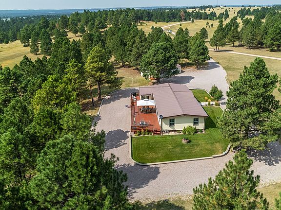 Rare 22-acre offering has an immaculate home set among the pines. Close to town, yet country setting with privacy, no covenants and access to State Land. A year-round residence or a Black Hills vacation getaway. The well-kept three-bedroom home is situated on a timbered plateau with southern exposure and is surrounded by a meticulously manicured lawn. The comfortable home design features open living spaces and lots of natural light. Many upgrades: steel roof, steel siding, new windows, engineered wood flooring, quartz counter tops, updated bedrooms and more. The kitchen has quartz counter tops, ample cabinets and counter space, and includes two wall ovens, island with cooktop, and snack bar with zebrawood counter top. Sunny living room open to the kitchen and dining room. Inviting sun room has four sliding glass doors leading to the sizable deck, which is the perfect place for outdoor gatherings, enjoying nature & wildlife viewing.