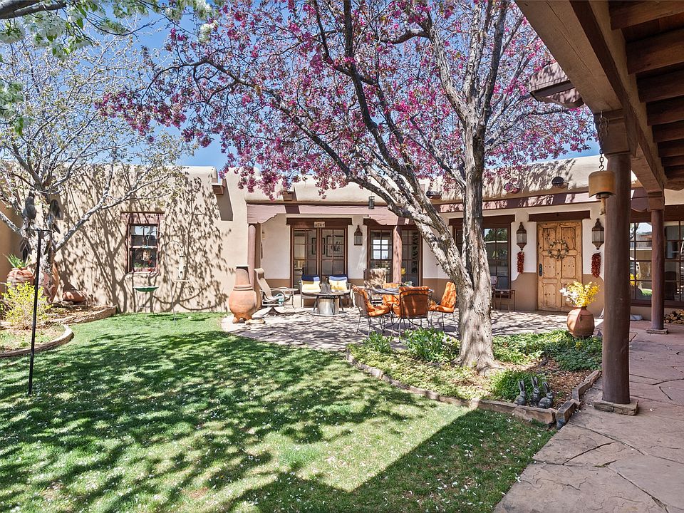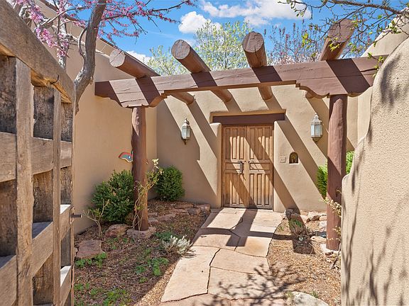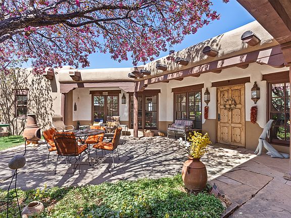 Sited on a 1.22-acre lot, this enchanting home offers superb sunset vistas and a serene ambiance. With 5 bedrooms and 5 baths, the main residence features 4 bedrooms while an attached casita provides a comfortable 1 bedroom, 1 bath retreat complete with a living room, kiva fireplace and kitchenette. Spanning 4087 sqft, with 3167 sqft in the main house and 920 sqft in the guest house, this Santa Fe Pueblo-style residence exudes charm and comfort. A double gated interior courtyard welcomes guests and provides respite with mature landscaping, green grass and a water feature. Inside, flagstone and brick floors, vigas, cove ceilings, a central kiva fireplace and plaster walls accentuate the authentic Southwestern atmosphere. There is a large, open living dining area with built in buffet, hand-carved cabinets and French doors to the portal. The primary wing is well separated from the guest areas and includes a modest office, fireplace, large bathroom with double vanities, dual closets and separate bathing areas. French doors provide access to the outdoor space and frame the western views. There are two guest bedrooms, each en-suite and a separate wing with a fourth bedroom/office and bath. A rooftop deck and generous west-facing portal provide Sangre and Jemez Mountain View’s capturing spectacular sunsets. This property provides a seamless blend of indoor and outdoor spaces and exemplifies Santa Fe living. Memberships to the Club at Las Campanas are available for purchase and upon approval.