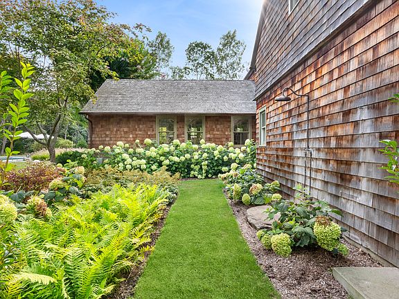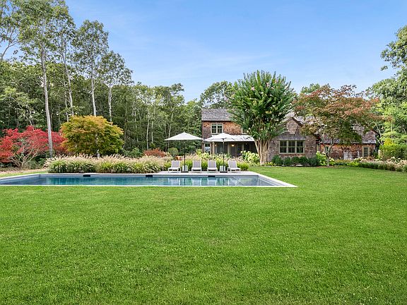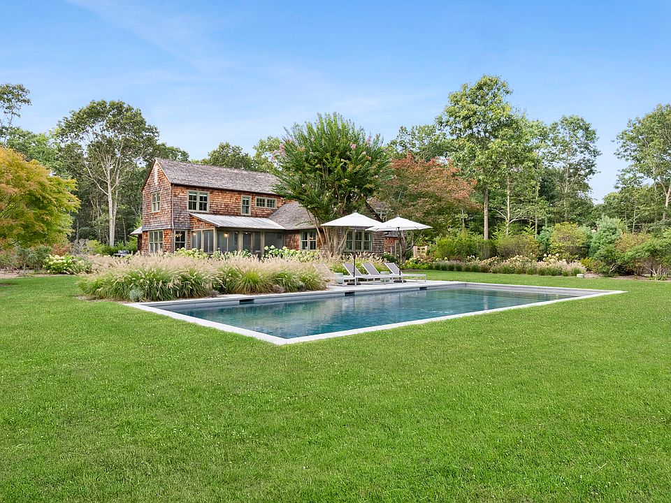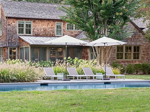 acres in Sagaponack North, this exceedingly stylish and recently renovated 4 bedroom shingled traditional home has an easy indoor outflow from the screened porch to the heated, gunite pool and dreamy outdoor spaces. Peastone patios lined with hydrangeas create elegant outdoor entertaining spaces with a gas fire pit lounge area and al fresco dining. An outdoor shower accompanies the pool. The home opens on an entry foyer with powder bath. The voluminous living room, accented by exposed beams, has a gas fireplace, cozy window nook, and sliding French doors out to the bbq and fire pit area. The exquisitely finished and appointed gourmet kitchen with island seating and vintage, European industrial light fixtures opens to a bright dining area and the screened porch. The main level primary suite faces south for delightful natural light. The luxurious primary bathroom has a dual vanity, steam shower, radiant heated flooring, and fixtures by Waterworks. A handsome office, laundry room, and attached 2 car garage complete the main level. Upstairs, two spacious en suite bedrooms profit from comfortable furnishings, tasteful design, and lovely views of the property. A bright and airy gym completes the upstairs. The finished lower level, to be completed by Memorial Day 2026, will feature a gym, living room and game room with wet bar, wine room, second laundry room, and two en suite bedrooms. Located near Sagaponack Farm Distillery and Wolffer Vineyards, this convenient and centrally located rental is a short ride to ocean beaches like iconic Sagg Main and easy to access Bridgehampton and Sag Harbor Village.