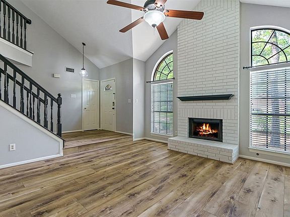 Beautifully updated home in a great location of The Woodlands! New wide plank flooring runs all throughout the downstairs. Freshly painted upstairs and downstairs. Adorable remodeled kitchen that includes granite countertops, updated backsplash and the kitchen refrigerator stays. Enjoy this open floorplan with high ceilings and a beautiful brick fireplace in the family room. The kitchen is open to the breakfast area and living room. Upstairs includes 4 bedrooms with 2 baths. Walking distance to a local park in the subdivision! Zoned to Galatas Elementary. Large porch in the backyard. Don't miss this great home with an open floorplan, new downstairs flooring and neutral, fresh paint throughout!