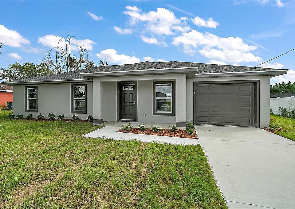 Excellent and affordable new construction that is completed and move-in ready. This conveniently located concrete block and stucco home features ample kitchen cabinetry, vaulted ceilings and luxury vinyl plank flooring throughout. Kitchen features granite counters, soft close shaker style cabinets and stainless appliances. Upgraded plumbing fixtures, lighting and fans. Lots of storage - master suite features walk-in closet. Location convenient to Ocala, Belleview and The Villages.