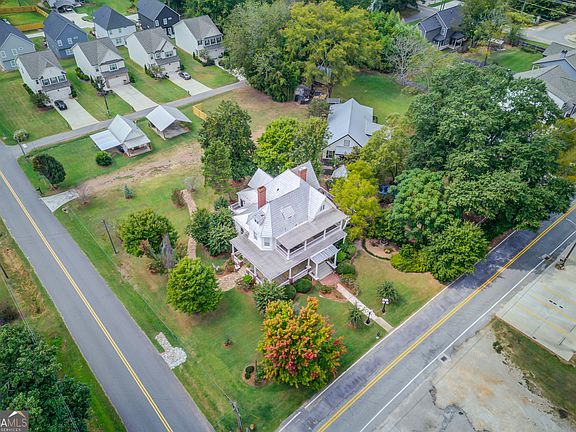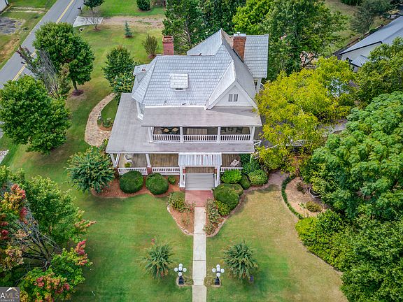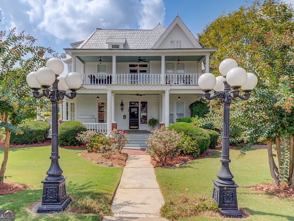 Grand Historic Home with Expansive Entertaining Spaces and Timeless Charm. This extraordinary residence, formally used as Tea Room, offers three levels of living space, stunning architectural details, and endless possibilities for entertaining. From the moment you arrive, the wrap-around covered porch welcomes you to a home rich with history and character. Step inside to discover custom millwork, vintage chandeliers, ornate door hardware, and seven unique fireplaces, each adding to the warmth and elegance of the home. The main level features a grand formal dining room, a royal front bedroom with its own vintage vanity. An additional bedroom donning a custom fireplace and en suite bath boasting an antique clawfoot tub await relaxation. Toward the back, you'll find a cozy fully wood-paneled family room with it's adjacent bar. Down the custom designed wainscoting hallway is a charming half bath. Chef's dream kitchen anchors the back of the home with a commercial grade gas range and vent hood with additional stainless appliances to handle the largest of gatherings. The sprawling granite counter tops accent the unique rich wood with beveled glass cabinetry accented by heirloom wooden artistry. On one side, the kitchen has it's own private deck and stairs leading to the back of the home. On the opposite side, both the kitchen and the family room open directly to a sprawling private deck perfect for large gatherings, especially since it joins the covered front porch. It's an ideal open-air space for lively entertaining. The second story offers a lofty relaxing area and two colossal front bedrooms overlooking an expansive balcony, which could host its own party. And there is more... a third royal bedroom is on the second floor which is converted into a one-of-a-kind luxury boudoir featuring a black-and-gold clawfoot tub. Escape to the solitude of the third floor lavish bedchamber, complete with a stately bedroom, snuggle ready sitting room, and relaxing full bath. Donned with its own separate cooling system, this world is your own. It's a perfect retreat for guests, and was formally used for bridal preparations. Outdoor living is equally impressive, vintage street lighting welcomes passers by, a four tier water fountain adds serenity to front porch relaxation. From the side porch, a flagstone walkway winds around to the covered parking and guest bungalow. It's sweet rocking chair front porch invites a cool glass of sweet tea and conversations that bring smiles. Step inside where life is easy in this one-bedroom, one-bath guest home. This remarkable Estate is a rare find - blending historic character, custom craftsmanship, and unmatched space for entertaining into a property like no other. As a former tea room, the possibilities are endless. This is truly a MUST SEE HOME!