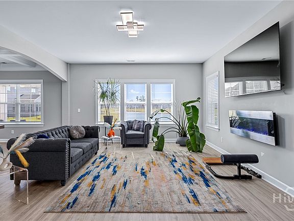 The heart of the home is the chef-inspired kitchen, complete with granite countertops, upgraded appliances, a center island with prep space, and bar-top seating that flows seamlessly into the dining area and spacious living room, perfect for entertaining and everyday living.