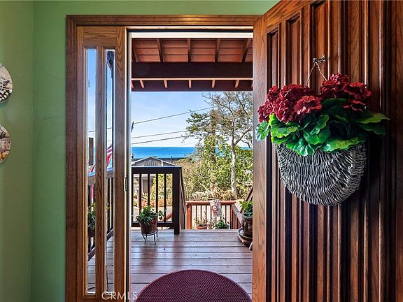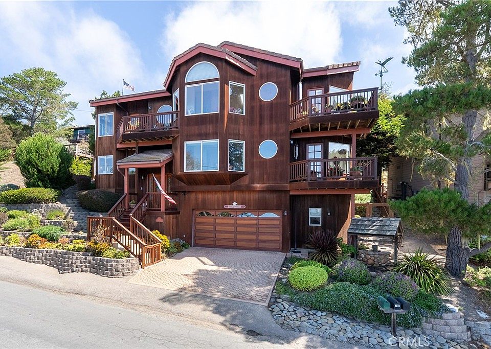 Custom built redwood home designed to capture sweeping ocean views from nearly every room. The open floor plan blends kitchen, dining, and living spaces with walls of westerly windows framing the Pacific, while easterly windows and decks look out over peaceful private gardens. The kitchen is a true centerpiece with custom Corian countertops, handcrafted tile backsplash, a garden window, 36-inch five burner cooktop, custom wood floors, and a shiplap ceiling, all opening seamlessly to the living areas. The living room invites gatherings with its woodburning fireplace, brick hearth, built-in bookcases, and massive window seat. A dumbwaiter provides effortless convenience with an access door on each level, perfect for moving groceries and household items with ease. The primary suite is a private retreat with a gas fireplace, two walk-in closets, spa-like bathroom with jetted tub, separate shower, dual sinks, and a private deck overlooking the Pacific. A second oversized window seat adds warmth and character to the suite. Situated on three lots, the property enjoys drought-tolerant landscaping sustained by an artesian-fed water capture and storage system. Every level features a deck to take in the views, while the concrete tile roof, cobblestone-style driveway, and two-car garage enhance its quality and appeal. Built by sought-after Brian Wilson. Located in one of the most sought-after neighborhoods near both the ocean and Fiscalini Ranch, this one-of-a-kind home pairs custom craftsmanship with coastal living at its finest.