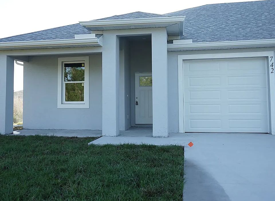 2024 new house 1,683 sq ft. 3 bedrooms 2 bathrooms and a covered patio Lanai, 6 feet tall backyard fence for your privacy. The modern kitchen with large quartz countertops offers an eat in sitting area, ceramic backsplash, smart luxury stainless-steel appliances and wood cabinets, three cars driveway and one-car garage with remote control door opener, impact windows throughout. The Master bedroom has a walk-in closet and bathroom with quartz countertops and modern tile shower. Sprinkler system on both yards. Washer and dryer hook ups available. NO water bill, NO sewer bill, NO landscaping bill.