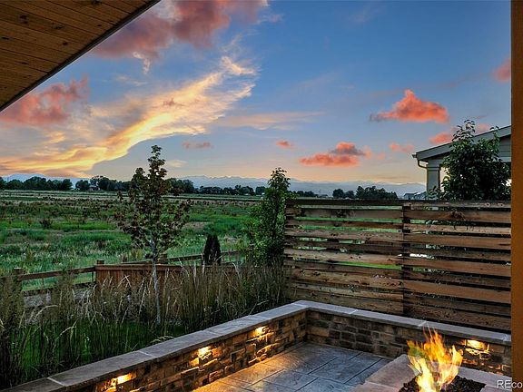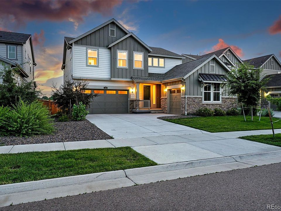 Welcome to this stunning home that surpasses new construction, featuring luxurious custom upgrades added since purchase. The backyard backs to expansive open meadow with breathtaking views of the Front Range. It includes a high-end hot tub, an elegant wood awning, a gas fire pit with masonry surround and dawn to dusk lighting, and heaters creating the perfect outdoor retreat. The Aspen model offers a highly desirable floor plan with four bedrooms upstairs (plus a loft space) and an additional bedroom/office on the main level. Interior highlights include wide plank wood flooring, white cabinetry in the kitchen, quartz counters, a gas cooktop, double oven, and a soaring two-story living room. Enjoy custom window treatments, many of which are electronically operated, for added convenience and style. The unfinished basement provides an excellent opportunity to expand the finished living space to suit your needs. A solar panel lease allots for only ~$40 per month, significantly reducing your energy costs. The property also includes a spacious three-car garage. The seller has invested more than $125,000 in upgrades since purchasing, which the next owner will get to enjoy! Additional bonuses: dual zoned heating and cooling, two furnaces and two air conditioning condensers for ultimate comfort and efficiency and a thoughtfully designed irrigation and drip system along with a programmable Rachio system.