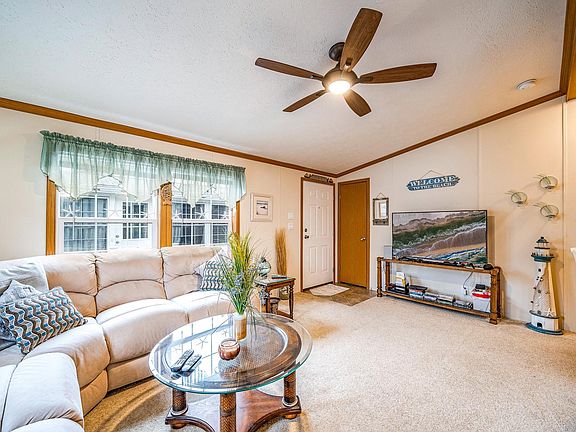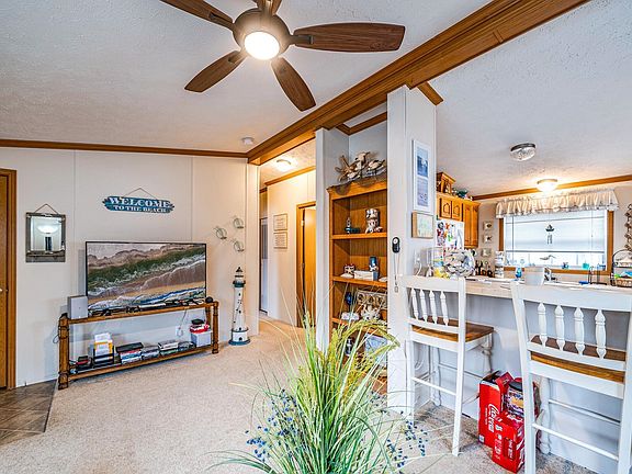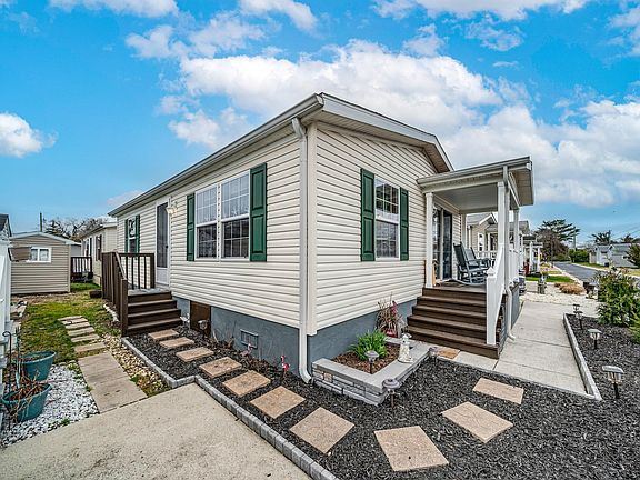Welcome to this charming 2 bedroom, 1 bath home with excellent curb appeal! Head inside to find a spacious living room with a built-in bookshelf, rich wood accents, and a breakfast bar overlooking the kitchen. The generous kitchen hosts an amazing number of cabinets, counter space, and a full complement of matching appliances. The kitchen also provides space for a table and chairs and French sliding doors to the front deck. TWO airy bedrooms share the full bath which includes additional storage space and recessed lighting. Outside you will find space for a firepit and chairs as well as a storage building perfect for your beach gear. Perfectly situated between Cape May and the Wildwoods and in close proximity to shopping, restaurants, and entertainment. Parking for 2 cars (tandem). Lot Rent $495 per month