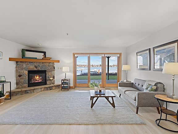 A rare ground-floor find just steps from the water at the Lodges at Quarterdeck, this former model offers the premier location in the development. The inviting great room blends kitchen, dining, and living spaces around a stunning Door County fieldstone fireplace—ideal for entertaining. This zero-entry end unit features two spacious bedrooms plus an office with a built-in Murphy bed. Enjoy sweeping waterfront views from the open floor plan and a private patio. Updates include new luxury vinyl plank flooring, a bright white kitchen with granite countertops, and new appliances. An attached garage adds convenience, and the Quarterdeck marina is just outside—rent a slip for effortless boating and access to the pool and additional amenities.
