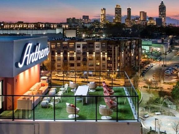 Amenities include a saltwater pool with sun deck and lounge seating, poolside cabanas, a rooftop club room overlooking Old Fourth Ward Park, a fire pit, grilling stations, and a clubhouse with a bar lounge.
