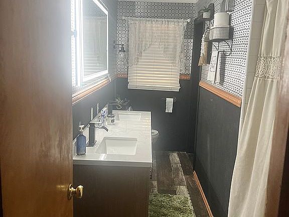 • Updated bathroom with a large LED mirror, double vanity, and modern black fixtures.