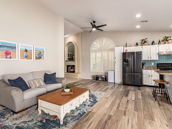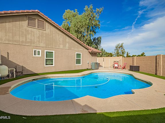 This inviting single level home offers 4 bedrooms and 2 bathrooms that is designed for comfortable everyday living. The interior features an open layout with the dining area just off the kitchen along with a sitting area and breakfast bar. There is room for another kitchen table by the sliding door which adds additional seating and a casual gathering space. The living room is right off the entry with a vaulted ceiling and a wood burning fireplace. The primary bedroom is a good size with an adjoining bathroom that has a exterior exit to your backyard and pool. The private swimming pool is fenced in for added safety and security. Situated on a corner lot and backing up to a green belt area, this home only has one neighbor on the side which adds to its privacy. The 2 car garage has built-in cabinets for convenient storage and organization. The front and back yards have low maintenance artificial turf. The San Marcos Park, with a children's play area, is only about a block away. This home blends comfort, functionality and lifestyle-friendly amenities into one appealing package.