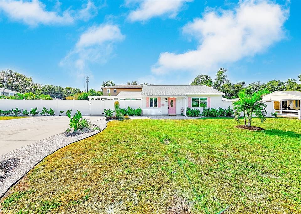 Welcome to an impeccably remodeled 2-bedroom, 3-bath home on a handsome corner lot with room to add a pool — in a full no-flood zone, less than 10 minutes from the beaches of Treasure Island, Madeira Beach and St. Pete Beach, and only 10–15 minutes to vibrant downtown St. Petersburg. Inside, the style feels entirely custom-designed: luxury vinyl plank flooring throughout, three beautifully finished bathrooms with distinctive tile work, and abundant attention to detail. The third full bath (recently constructed with future pool plans in mind) is sleek and modern; the second bath is a statement room with oversized polished porcelain tile (60×120), a freestanding tub set against a deep blue vertical tile accent wall and a floating wood vanity with brushed-gold fixtures; the primary bath exudes spa-like elegance with marble-look wall tile, hexagonal floor tile and a slatted wood-vanity design. The kitchen is full of personality and charm: butcher-block countertops paired with light-blue upper and white lower cabinets, stainless-steel appliances, an island cooktop, dog-themed wallpaper, and a bay window at the sink. In the adjacent dining area, built-in window bench seating complements a matching butcher-block table, and skylights overhead flood the space with bright, cheerful natural light. Major systems and structural upgrades have been completed 2023–2024: new HVAC with ductwork, full 200-amp electrical service and panel, hurricane-impact sliders & windows, fresh exterior paint (2024), new vinyl privacy fence and gating for vehicle/boat/RV storage, programmable outdoor lighting, well-pump irrigation system, and two large aluminum storage sheds (16×8 & 7×6) for generous storage without rust. Mature Peruvian Apple cacti anchor the landscaping, together with recently planted palms, avocado and orange trees — a lush backdrop that complements the clean modern interiors. In addition to all the stunning updates, this property offers incredible future potential. The City of St. Petersburg recently adopted temporary regulations allowing Accessory Dwelling Units (ADUs) to help increase affordable housing options. With this large corner lot, there’s ample room to add both a pool and an ADU (or two, if the sheds are relocated) — perfect for generating rental income, creating a guest suite, or providing private space for extended family. This home is truly move-in ready, thoughtfully updated from top to bottom, offering designer styling, peace of mind, and a prime location — with even more opportunity ahead.