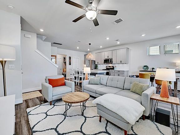 Welcome Home! Experience modern design and resort-style living in this 3-bedroom, 2.5-bath home. The open-concept layout seamlessly connects the living, dining, and kitchen areas. Luxury vinyl plank flooring and recessed lighting create a bright atmosphere, while an accent wall adds character.The kitchen is a culinary dream, featuring an oversized island, breakfast seating, and a stylish tiled backsplash. Sleek countertops and soft grey cabinets with black handles provide ample storage, complemented by stainless steel appliances.Upstairs, you'll find two spacious bedrooms, a cozy nook for reading or working, and a serene primary suite with a tray ceiling, ceiling fan, large windows, and plush carpeting. The primary bathroom offers dual sinks, ample storage, and a luxurious extra-large shower for a spa-like experience.Outside, the covered back patio and mini green oasis provide the perfect spot to enjoy the Texas weather. Neighborhood amenities feature a pool, pickleball court, multiple playgrounds, and a state-of-the-art amenity center.