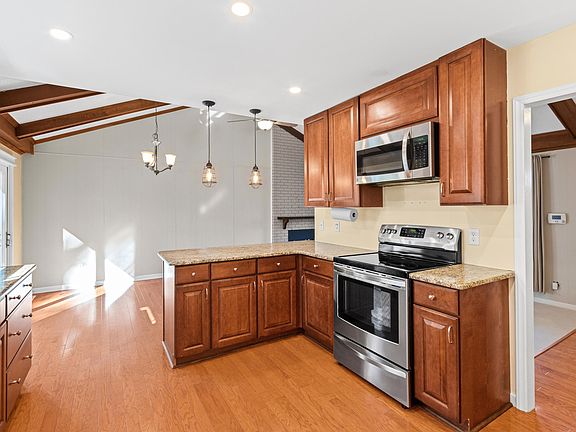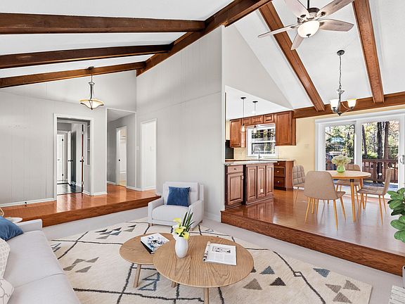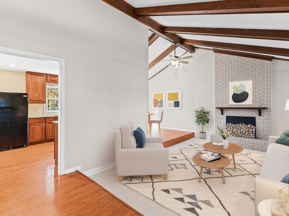 Step into a truly exceptional 1976-built ranch-style home that exudes charm and personality you simply can't find in today's cookie-cutter houses. Nestled on a generous 0.57-acre lot, this property combines retro flair with modern updates for a living experience that's as distinctive as it is comfortable. From the moment you enter, you'll be captivated by the grand cathedral ceilings with exposed beams, filling the open living and dining spaces with character and light. The sunken living room, complete with a cozy conversational pit and wood-burning fireplace, offers a nostalgic touch of architectural brilliance that makes this home truly stand out. The kitchen is both stylish and functional, featuring granite countertops, 42'' raised panel cabinets, brushed nickel hardware, a pantry, and tile floors—ideal for everyday cooking or entertaining. The primary suite continues the theme of uniqueness, boasting hardwood floors, a walk-in closet, and a ceiling fan. Its updated, moody en suite bathroom with granite vanities and tile floors is a perfect blend of elegance and edge. The third bedroom provides versatility for a guest room, home office, or hobby space. Outside, a fenced backyard with a spacious deck offers ample room for outdoor activities and gatherings, surrounded by the serenity of mature landscaping. This home is ideally located within walking distance to Fox Road Magnet Elementary, Triangle Town Center, and Wake Tech, with quick access to Capital Blvd and I-540. Whether you're drawn by its prime location or its undeniable charm, this home is truly a rare find—a masterpiece of individuality and timeless design. Don't miss this opportunity to own a home that's as unique as you are!