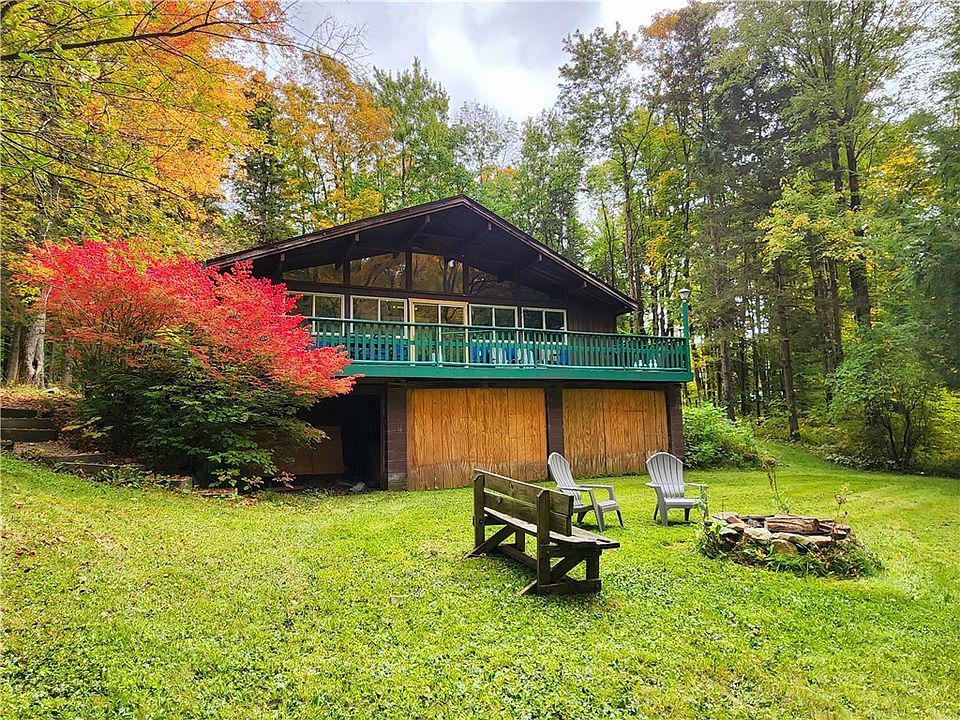 Welcome to Lazy Bear Lodge, where all your worries fade away. You breath in the fresh mountain air and listen to the sounds of birds chirping. Just over a mile away from the famous Harriet Hollister Park and surrounded by peaceful wilderness, hiking trails, snow mobile trails and hundreds of acres of state land. This adorable chalet is privately situated on a wooded 1 acre lot. With a wraparound deck overlooking your private yard, you can hear the stream flowing all year round. Guests have traveled from all over the world to stay at this tiny piece of Finger Lakes heaven and now you have the opportunity to make it your own. Stay warm by your wood stove all winter long, 2 bedrooms including the loft, 1 full bath (basement plumbed for full bath). Updates include a tear off roof (2019), new hot water heater (2022), Upgraded and all new electrical service and panel (2023), new electric heat pump furnace and central air (2023). Showings to begin Sunday October 1st at 1pm, Delayed negotiations until Friday October 6th at 3 pm.