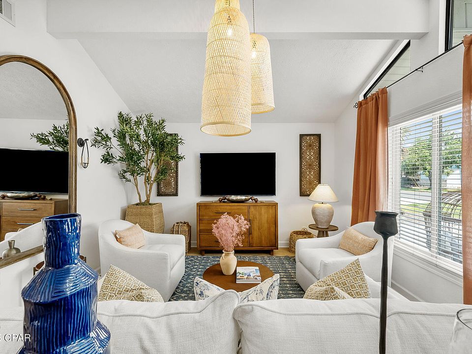 Inside, you're greeted with vaulted ceilings, abundant natural light, and a seamless open-concept living, dining, and kitchen area that feels both spacious and inviting. The interiors blend coastal elegance with Mediterranean inspiration, featuring warm textures, designer lighting, and thoughtfully curated finishes that create a spa-like, relaxing atmosphere. The kitchen boasts brand-new stainless steel appliances, while the stylish bathrooms feel like a private retreat. Each bedroom is outfitted with a large TV, and storage is plentiful with two outdoor sheds for bikes, beach gear, or tools.