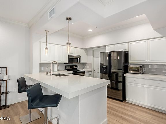 This GROUND-FLOOR (end unit) gem offers INCREDIBLE VIEWS of the Arrowhead Golf Course and serene lake, visible from every window and patio. The view alone makes this lot a rare find, and it's paired with NO STAIRS for easy living. Step inside to discover a recently updated kitchen featuring quartz countertops, modern appliances, RO system, and layered crown molding. The home boasts recessed lighting on dimmers, updated window coverings, and no carpet -only beautiful, newer wood-look flooring throughout. Tons of natural light. With plenty of storage space, you'll find comfort and convenience in every corner. This spacious 2-bedroom, 2-bathroom home radiates pride of ownership, with all essential appliances included: Washer, Dryer, and Refrigerator. Plus, you'll love the direct GARAGE access to the home and the extra parking available by the unit. Situated in a gated community, enjoy a short walk to the heated pool and 5 minute walk to the Country Club. Located with easy access to the Loop 101, and close to parks, shopping, and dining - everything you need is within reach. This is a must-see home where lifestyle and comfort meet in perfect harmony. Don't miss out on this one-of-a-kind opportunity.