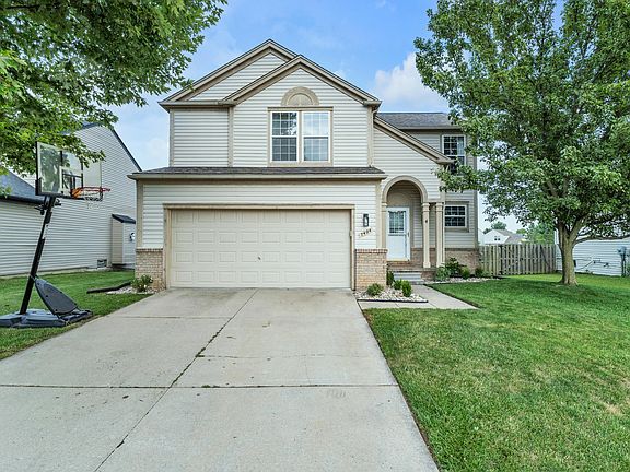 Step into a well appointed home in the desirable Green Farms community with brand new furnace and AC. This home is in a prime location backing to the community play ground. Inside on the entry level you will find low maintenance flooring, a study or multi-purpose room, half bath, open concept living space with fireplace, dining area, and large kitchen. There is a sliding door to the deck (2020), and the kitchen features SS appliances (dishwasher and fridge 2025), granite counters, laundry room (new dryer), and attached 2 car garage. Upstairs find a generous primary suite with vaulted ceilings, double sinks, and walk-in closet along with 3 other ample bedrooms and a full bathroom. The basement offers a large storage area or multi-purpose space. Outside is a fenced yard with newer deck and patio as well as a gate out to the community common area and play ground. Don't miss this amazing Greene Farms opportunity!!