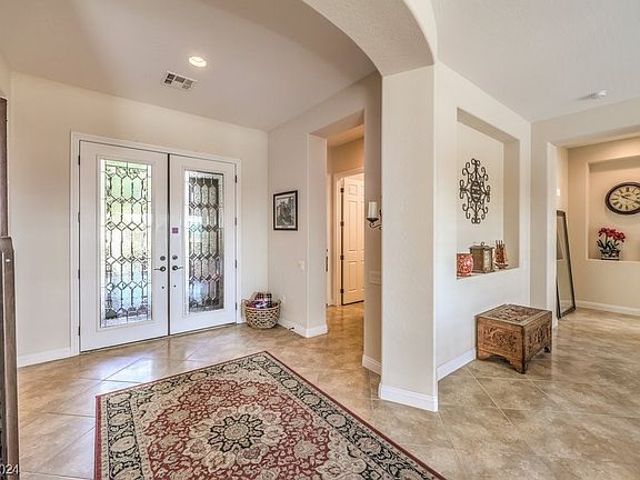 This beautiful executive-style 1 story Golf Course Sagecrest model has no one behind you. Located in the guard-gated community of Club Aliante w country club-like amenities including a pool, spa, tennis, pickleball, Bball, fitness center, and recreation room, playground. This exquisite home is well-appointed with a gourmet kitchen, granite countertops & backsplash, Stainless steel GE Monogram appliances, a built-in refrigerator, double ovens, upgraded 42"cabinets, 10 ft ceilings 8 ft doors, double doors open to a breathtaking formal entry with a very open floorplan, fireplace in great room. Large primary bedroom & gorgeous bath with marble & walk-in closet. Enjoy entertaining in the backyard with a stunning golf course & mountain view and extended patio cover. This community is exceptional with the amenities and convenient location to shopping, expressway, and dining, is near Aliante casino & a short drive to Nellis, and has many parks. Right in the heart of everything! Must see!
