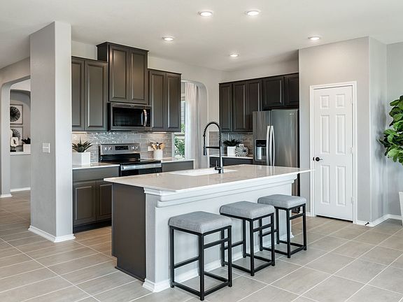 This beautiful, two-story home features an open floor plan with 9-ft. first-floor ceilings, a spacious great room and Flex Space perfect for a home office or gym. The modern kitchen showcases Woodmont® Shaker-style maple 42-in. upper cabinets, Silestone® countertops and tile backsplash. The downstairs primary suite boasts a walk-in closet and connecting bath that offers Silestone countertops, a dual-sink vanity, marble garden tub and separate shower with tile surround. Upstairs, a game room provides space for a study or media area. Additional features include plush carpeting at game room and bedrooms, vinyl plank flooring at kitchen, great room and Flex Space, 2-in. cordless blinds and ceiling fans at great room and primary bedroom. Entertain family and friends on the covered back patio. Current time frames before closing may be longer than originally anticipated. See sales counselor for approximate timing required for move-in ready homes.