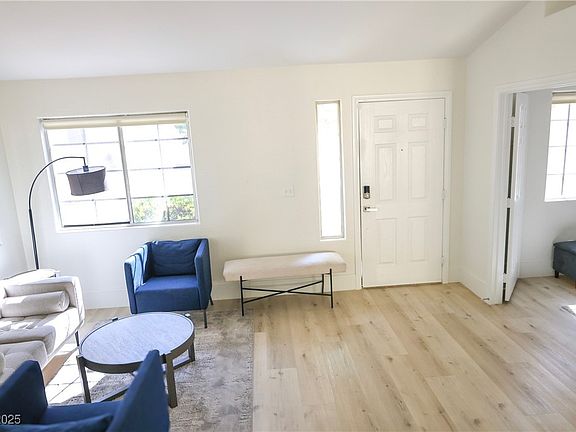 This charming and well-maintained 3-bedroom, 2-bath residence is tucked away in the beautiful Northwest Las Vegas. Soaring vaulted ceilings fill the open floor plan with natural light, creating an inviting atmosphere. A cozy two-way fireplace serves as a stunning focal point perfect for adding warmth in the winter or ambiance during dinner parties and special gatherings. The oversized primary suite is a true retreat, featuring a spacious ensuite with a separate shower and soaking tub. A versatile third bedroom offers flexibility as a guest room, office, or den. Additional highlights include modern 7" baseboards throughout, plush carpeting in the primary and secondary bedrooms, and an oversized 2-car garage with extra storage. The home also comes equipped with a water softener, plus washer and dryer. Enjoy low-maintenance landscaping with artificial grass in the front yard, and take advantage of the convenient location near schools, shopping, dining, hospital, and freeway access.