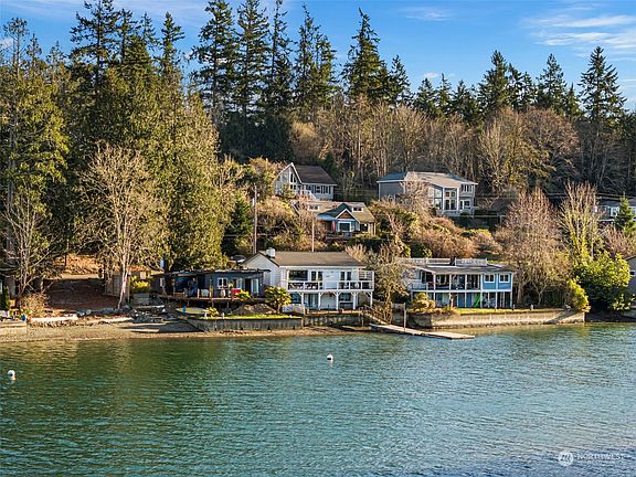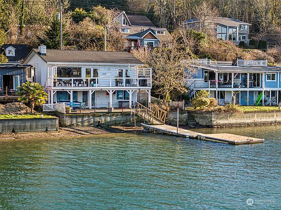 Dive into exciting waterside living in Gig Harbor! This enchanting home on a 50 ft no-bank waterfront offers stunning Carr Inlet and Olympic Mountain views. It features a private dock and a new attached float, plus 2 decks. Inside, find a beachy, retro-style great room, Big Chill appliances, 2 bedrooms plus flex space, 2 baths, a bonus room, garage, and boat storage. Newly painted with an updated roof, it's minutes from amenities. Every room showcases breathtaking views, perfect for savoring coffee or sunsets. The property includes a fenced yard and patio for safety, plus a separate garage with an office across the street, under an easement agreement. Embrace a lifestyle of exhilaration and scenic beauty in this waterside haven!