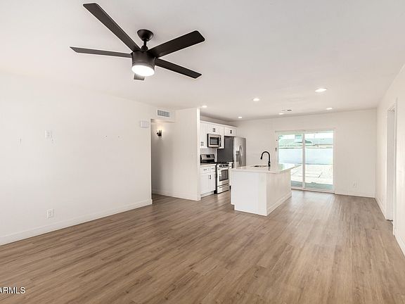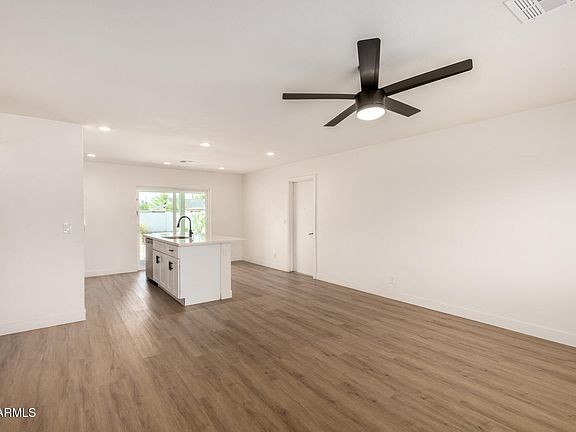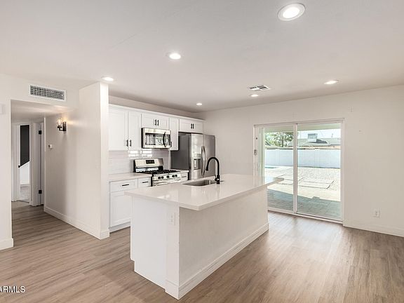 Discover all the charm of this stunning single-story home with heated POOL! Designed with style and comfort in mind, this gem features an open-concept layout perfect for entertaining, showcasing wood-look flooring, abundant natural light, and neutral tones. The impeccable culinary space displays shaker-style cabinets adorned with crown molding, tile backsplash, solid-surface counters, stainless steel appliances, and an island with a breakfast bar, for those casual conversations over quick bites. All 3 bedrooms have carpet. The primary retreat hosts a closet and a bathroom for convenience. Out back, you'll have your oasis, complete with a cozy covered patio with well-laid pavers, perfect for relaxation, a built-in BBQ and a lush lawn in your very spacious backyard. plenty of seating space, and a fun and vibrant mural accompanying the sparkling pool, all creating a fantastic atmosphere for outdoor entertaining. What's not to love? Make it yours!