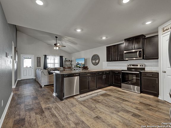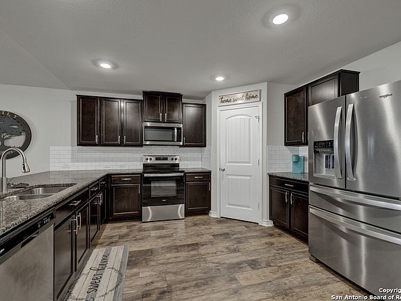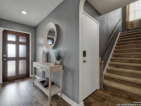 Does this tough market have you down? Still looking for a great deal? Here is your chance to get a three-year-old home at a bargain price! Located in the Solana Ridge community, not far from Lackland AFB, you will find this four-bedroom, two-and-a-half bathroom, two-car garage sitting on a spacious lot with no back or right side neighbors-just the open air to enjoy the covered patio or the pergola seated on a wood deck. The exterior also features drought-tolerant landscaping, a complete sprinkler system, and brick siding. The interior of the home has a great layout! The open floor plan features about 2400 sqft of living space with high ceilings, formal dining room and the master bedroom down stairs. The master bath has a double vanity, separate tub, and shower with a walk-in closet equipped with a gun safe. The home's second floor has three secondary bedrooms, a full bathroom, and a loft for a second living space. If you still need more incentive to call this gem your home, the flooring on the first floor is vinyl plank and tile, the kitchen has 42" cabinets with a stainless appliance package, and the half bath has been remodeled and updated to go with all the recess lighting in the home. See this beauty today!