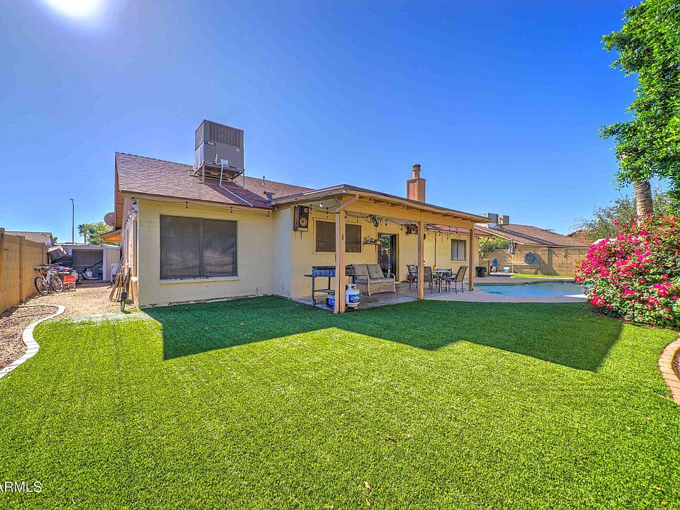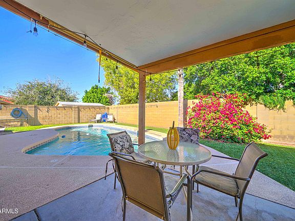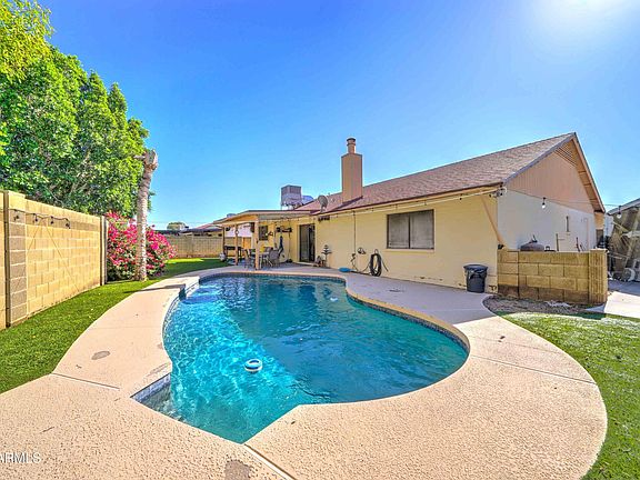 NO HOA! Discover this spacious 4-bedroom, 2-bathroom block home, with 2,111 sq ft on an 8,363 sq ft lot in the Peoria school district. Step into the gorgeous backyard oasis with a gracefully curved sparkling pool, lush green lawn, and covered patio perfect for relaxation or entertaining. Inside, larger than it appears, the open floor plan connects generous living, family, and dining areas under high ceilings, filled with natural light from abundant windows and offering good-sized closets in each comfortable bedroom. The primary bedroom includes a roomy walk-in closet, plus a large laundry room with handy shelving. Out front featuring clean desert landscaping with mature palms trees out front. Wide RV gate with slab parking to the side. Well-maintained and move-in ready!
