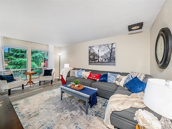 Adorable/affordable townhouse style condo along Black Lake. Upon entry you will find an updated bath and the stairwell with custom PNW painting detail to distinguish the home. The entire lower level has new updated flooring, refinished wood cabinets, and new lighting to make it contemporary and bright. Forest view from dining and living space. Galley style kitchen and laundry. Upper level houses two bedrooms with views of the serene forest. Complete remodel of upper bath. A charming retreat with window to study, read or relax with built in shelves and desk for a cute office space makes use of every inch. Tons of storage in this home. Newer roof and paint on exterior of home makes this a real gem; and don't forget the charm/calm of the lake.