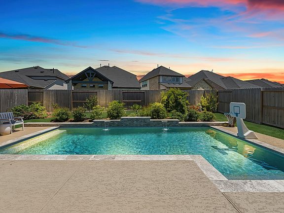 RARE opportunity to own a POOL home in Fulshear for under $500K! Live the resort lifestyle every day in this STUNNING 1-story Tri Pointe home built in 2023. Beautifully designed with a brick elevation and loaded with upgrades, this 3–4 bedroom, 2.5 bath gem offers an open, light-filled layout, wood-plank tile floors, soaring ceilings, and 8-ft doors. The flexible plan includes two spacious secondary bedrooms plus a large flex room perfect for media, hobbies, or a 4th bedroom. The bright family room showcases views of your private backyard oasis with PebbleTec pool and extended covered patio ideal for entertaining or relaxing. The gourmet kitchen features quartz counters, white cabinetry, and a sunny breakfast nook. The primary suite offers a spa-inspired shower, dual sinks, and Grey Wolf cabinetry. Enjoy resort-style amenities, fitness center, lakes, trails, and an amenity center, all within walking or biking distance. Get into your DREAM home with its DREAMY pool before the HOLIDAYS!