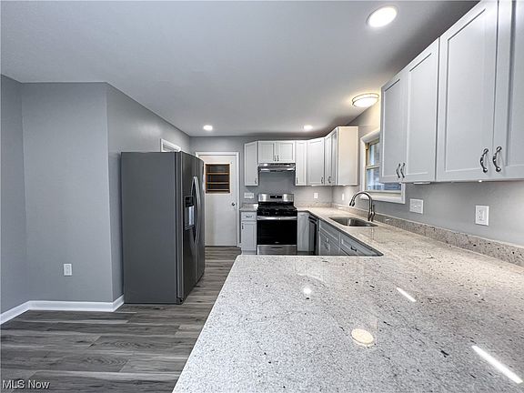 Beautiful Canfield Ranch home sitting on nearly a 1/2 acre! This freshly remodeled has new everything! New roof, new entry doors, new kitchen including cabinets, granite countertops, new stainless steel appliances, under cabinet lighting, new flooring, and lighting throughout. The living room has a gorgeous fireplace, and sliding doors that open to a private side patio. New bathrooms, including tile floors and showers, new vanities with granite countertops, and new lighting. New carpet in all the bedrooms. Basement has a fireplace with newly painted epoxy floors and fresh wall paint. Water proofed with sump pump. Huge sunroom off of the back of the garage, looking into the large backyard! Perfect for your new hot tub, or just to relax on a hot summer night! This home will be yours to create memories for years to come. Hurry this won't last long! (House has some rooms that have been virtually staged, furniture is not real, for decor ideas only)