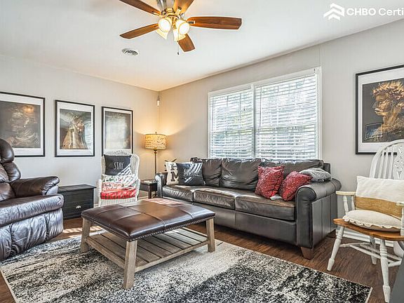 Inside, the home features spacious common areas centered around a fully stocked kitchen, a welcoming living room, and a dining space designed for gathering and relaxing. The kitchen includes thoughtful extras like a Keurig with K-Cups, an electric water boiler, and all the cookware and dishware needed for longer stays. A dishwasher, full-size washer and dryer, and essential cleaning supplies are also provided for added convenience.