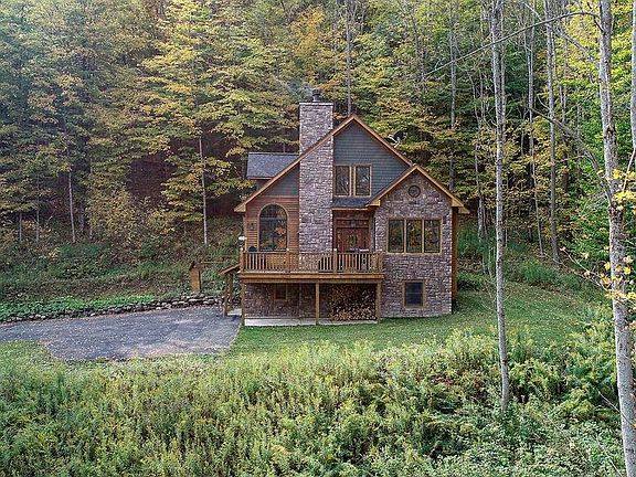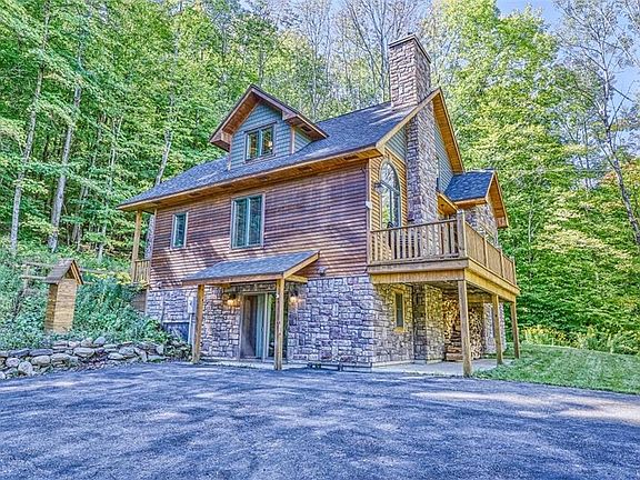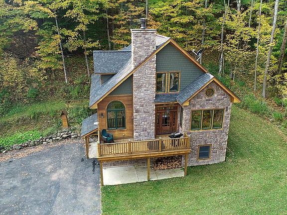 Planning a work from home/ vacation spot? This custom built gem nestled into a wooded hillside has CABLE & WIFI and is just minutes from the village of Ellicottville and HoliMont or Holiday Valley on a secluded but town maintained road. Built for entertaining with two gathering areas, a rec room, open floor plan with stone and re-claimed wood mantle with wood-stove insert, dining bump out looking out over the setting, and wonderfully appointed kitchen with granite, alder wood cabinets and stainless appliances. With three levels, radiant heat on the first floor, locally sourced wood interior walls for a true "lodge" feeling, deck off the great room, master bath with jacuzzi and walk in shower, and spacious bedrooms for visiting guests. The exterior is a tasteful blend of wood and stone siding bringing the rustic ambiance of the home and setting together. The high end furnishings throughout could be purchased separately but are not included.