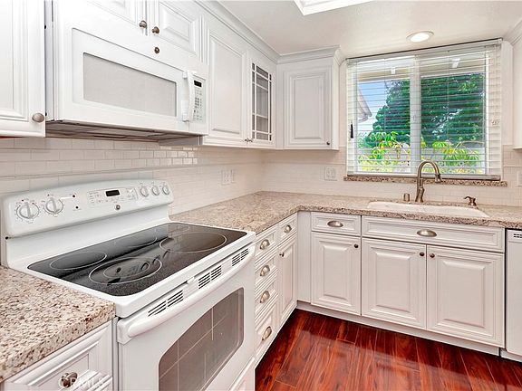 Curated in a warm cottage style, this beauty features a bright white kitchen with warm beige granite countertops and quiet close drawers. Plenty of storage and dedicated desk space. Upgraded appliances and window providing natural light. Wooden floors, new bright paint and crown molding flow seamlessly throughout the home. Ceilings updated with smooth modern finish. Updated bathroom with various lights and skylight to fit your needs. Stylish double sink vanity and safe shower. Topnotch washer/dryer combo conveniently located in the hallway. Big open living room/dining room combo with vaulted ceiling, floor to ceiling storage as well as plenty of light from windows and atrium. Two spacious bedrooms: one with wainscoting and warm grey paint off the atrium; the primary lit up by a huge window. Central AC and heating. Double paned windows. Nice front patio to expand your living space, plenty parking on front street and in the carport. Additional outdoor storage on porch and in carport.