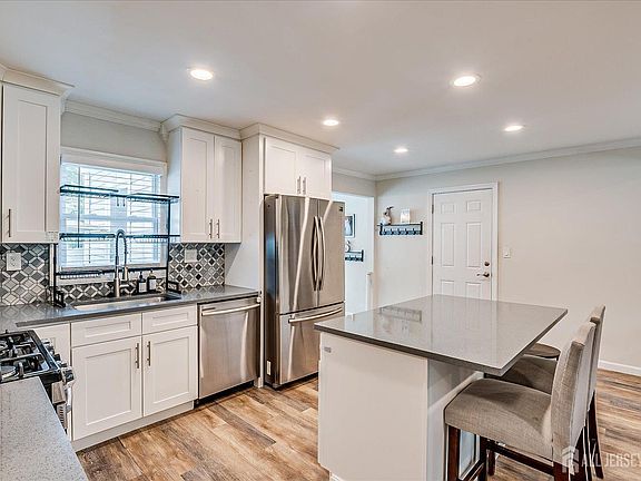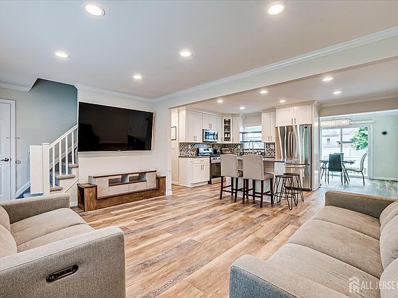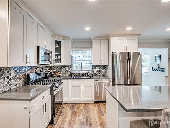Beautifully renovated from top to bottom, this turn-key gem with exquisite curb appeal shines in Rahway's sought-after Milton Lake neighborhood, just steps from the Clark border. The inviting open layout features a bright living area flowing seamlessly into a quartz kitchen with center island, stainless steel appliances, tile backsplash, and white shaker cabinetry, plus a dining room with sliders to the spacious vinyl-fenced backyard. Two bedrooms and a full bath complete the first level. Upstairs, the owner's suite includes a full bathroom and additional fourth bedroom currently designed as a full walk-in closet with built-in drawers and shelving easily convertible back to a traditional bedroom for added flexibility. This private upper-level setup adds comfort & convenience to the home's thoughtful layout. Both bathrooms are beautifully updated with modern tilework and fixtures. The finished basement adds valuable living space, ideal for a playroom, gym, or home office, with additional storage. Outside, enjoy a private fenced yard with a large concrete patio and storage shed ideal for outdoor entertaining.Added peace of mind comes with 360 degree camera coverage, security system, electronic front door & motion floodlights. The newly sealed driveway and manicured landscaping complete the picture. Located just 0.3 mi to Milton Lake Park and minutes from downtown Rahway's dining and arts scene, this home offers unbeatable access to NJ Transit's Rahway Station (direct line to NYC, 1.8 mi), Clark shopping centers including Whole Foods, Target, and ShopRite (2.0 mi), Madison Elementary School (0.4 mi), and Robert Wood Johnson University Hospital (0.5 mi). A polished blend of convenience and style. This home impresses on every level. Showings start Wed 11/12.