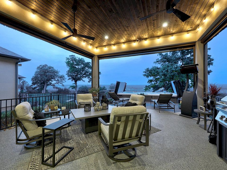 Epoxy-coated garageStylish living spaceSleek black stone fireplaceMeticulously maintained single-story homeUnobstructed hill country viewsBuilt-in outdoor kitchenStainless steel appliances