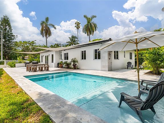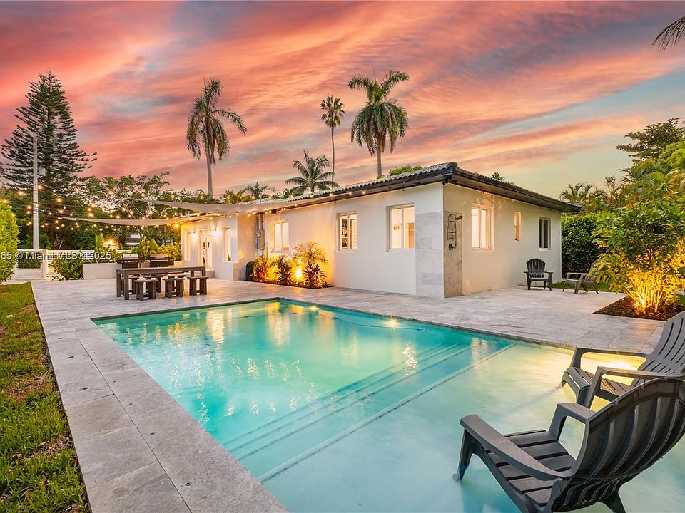 NEW POOL!! Beautifully renovated Mid-Century 3BR/2BA bungalow blends timeless charm with modern luxury. Light-filled open layout features a gourmet kitchen with terrazzo counters, new cabinets/appliances, custom closets, motorized Somfy shades, 86” LG & Samsung Frame TV, plus updated plumbing & electrical. Outdoors, enjoy a heated pool with sun deck, Traeger smoker, Nexgrill BBQ, bistro area & professional landscaping with pathway lighting. Secure gated entry with motorized gate, DoorBird access, Ring cameras, smart A/C, Lutron lighting & EV charging. Spacious driveway for 5 cars. Option to purchase fully furnished. Steps from Biscayne Bay parks, top schools, dining & shopping, this home offers style, comfort & convenience.