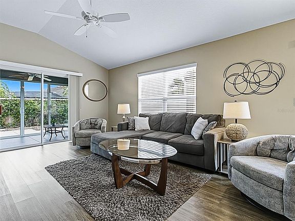 TURNKEY! Come see this beautifully constructed Concrete Cambridge Courtyard Villa located in the desirable Village of Sanibel. From the moment you arrive, you’ll notice the painted driveway and walkway, surrounded by low-maintenance rock landscaping and tropical plantings for year-round curb appeal. Inside, you’ll find NO CARPET—luxury vinyl plank flooring runs throughout the home. The spacious living room features vaulted ceilings and sliding glass doors that open to the glass-enclosed lanai, creating the perfect blend of indoor and outdoor living. The eat-in kitchen boasts a tiled backsplash, high-definition countertops, and a convenient closet pantry. The open dining area seamlessly flows into the living room, providing ample space for entertaining family and friends. The glass-enclosed lanai provides even more space to gather, featuring sliding glass doors that offer easy access to the patio for grilling or outdoor activities. The owner’s suite offers tray ceilings, a large walk-in closet, and a private bath with a tiled shower (complete with seat) and dual sinks. The guest suite also features vaulted ceilings and direct access to the guest bath, providing comfort and privacy. Additional highlights include an epoxy-finished garage floor and attic stairs for added storage space. This villa is ideally located near Sanibel and Captiva pools, the Colony Rec Center, shopping, dining, the Sarasota Golf Center, Bonifay Country Club, and more. You’ll be just 10 minutes from Brownwood Paddock Square and medical facilities, as well as 12 minutes from Lake Sumter Landing. Multiple executive and championship golf courses are nearby, making this a perfect spot to enjoy all The Villages has to offer.