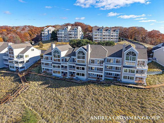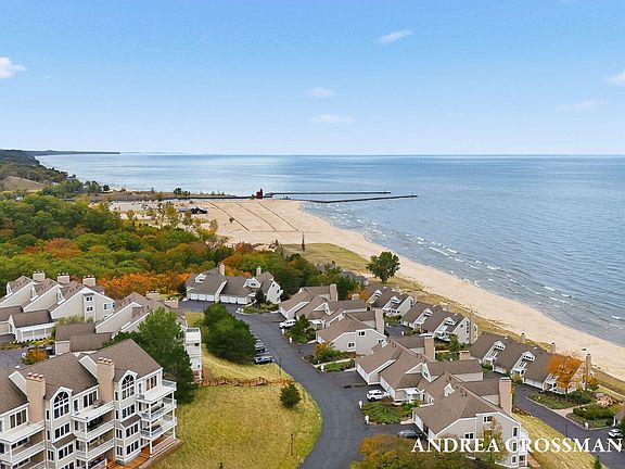 RARE Spyglass condo offering. This unit is 1 of only 8 with a two stall attached garage and is also one of the larger units in the community, offering panoramic views of the lake, the state park, and Big Red lighthouse. This unit was JUST refurbished and features freshly painted walls and ceiling, garage, cabinetry and trim. Updates include all new flooring, new light fixtures, new hardware, new toilets and mirrors, and solid surface counters in all three baths, kitchen, buffet, and the lower level wet bar. The fireplace features a new stone surround, and the bedrooms have newly tiled walls on the south wall. New AC was also installed. Can be sold with the recently purchased staging furnishings and wall hangings. GREAT sandy beach is walkable from from the pier and state park and continues north for miles. Enjoy community amenities including pickleball/tennis/basketball sport courts, fire rings and Adirondack chairs at the beach, a heated pool with baths, and excellent guest parking. Close to marinas, parks, restaurants, and town. This Middle tier unit has great views and breezes, and lots of outdoor living areas. The walkout lower level has wood decks and upstairs has two epoxied or resin balconies. One can park on the beach level and use one of two low bluff sets of stairs to the large shared beach. Spyglass is a great place to live and units don't change hands often, don't miss out on this great opportunity. One pet is permitted and may need HOA approval if more than one pet. No short term rentals are permitted but a unit can be rented to 3-4 times a year for a minimum of 30 days.