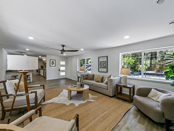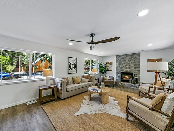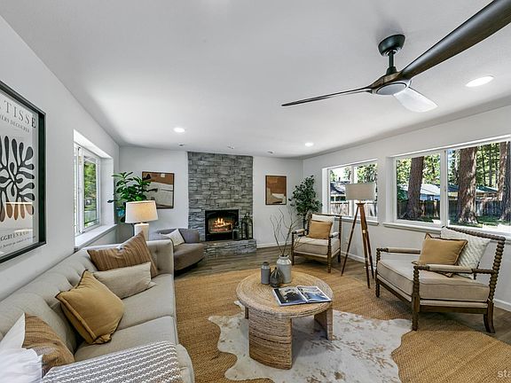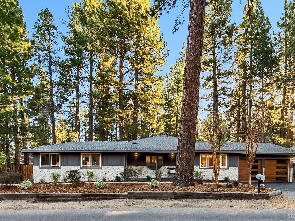 Discover this stunning single-level home situated on an expansive double lot spanning over 15,682 square feet in the desirable Tahoe Island Drive area. This recently updated residence offers three bedrooms and two bathrooms within 1,962 square feet of living space.The living area showcases a beautiful ledgestone gas fireplace, complemented by recessed lighting and laminate flooring that flows seamlessly throughout. Step onto the back deck to enjoy views of the huge level backyard, perfect for outdoor entertaining and recreation.The gourmet kitchen impresses with custom shaker-style cabinets, elegant quartz slab counters, and brand new stainless steel appliances including a gas range and beverage refrigerator. Adjacent to the kitchen, the dining room features distinctive pine tongue and groove pine ceilings that add rustic charm.The primary bedroom serves as a private retreat with an en suite bathroom featuring custom travertine, a modern stall shower, dual sink vanity, and updated fixtures throughout. Two additional guest bedrooms provide flexible space for family or visitors, served by a full bathroom with a relaxing jetted tub.Practical amenities include a spacious garage with a pull-through bay design offering abundant storage options. There is also space for parking a boat or an RV on the double lot. The location provides exceptional convenience, with easy access to the bike trail connecting to Pope Beach, Camp Richardson, and Fallen Leaf Lake. Outdoor enthusiasts will appreciate being just fifteen minutes from Heavenly Ski Resort, making this home ideal for year-round mountain living and recreation.