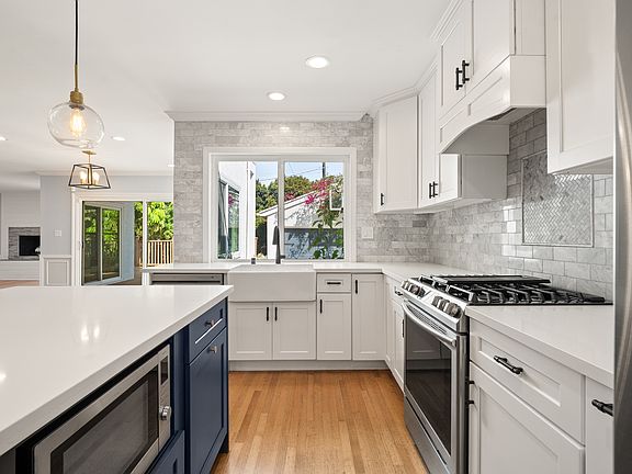 Perfectly positioned on one of North Kentwood's most desirable streets, this fully remodeled residence offers five bedrooms and four bathrooms across expansive, light-filled interiors. Designed with both style and functionality in mind, the home delivers effortless flow for daily living and entertaining. The main level welcomes you with spacious living and dining rooms, each with its own fireplace and direct access to the patio and grassy yard. The remodeled chef's kitchen anchors the home with a generous island, full pantry, and modern finishes including quartz countertops, white shaker cabinets and stainless steel appliances. Perfect for entertaining, the kitchen connects seamlessly to the family room with fireplace. A custom wine room tucked beneath the staircase, a full laundry room, and a chic three-quarter bath enhance everyday convenience. Two bedrooms complete this level, including one with an en suite bath ideal for guests or multigenerational living. Upstairs, the primary suite serves as a private retreat with vaulted ceilings, fireplace, balcony, and a spa-like bath with soaking tub, walk-in shower, and oversized closet. A second bedroom and a loft-style family room perfect for an office, media lounge, or playroom round out the upper floor. The property also includes a newly renovated 360-square-foot guest house. With vaulted ceilings, kitchen, bathroom, and pass-through window to the yard, this space is ideal for extended stays or as an entertainer's hub. Outdoors, a generous patio invites al fresco dining and lounging, framed by a lush lawn that extends the home's indoor-outdoor appeal. With its curated upgrades, versatile spaces, and sought-after location this home offers the best of coastal Los Angeles living.Qualifications: Minimum 750 credit score and income must be at least 3x the monthly rent.