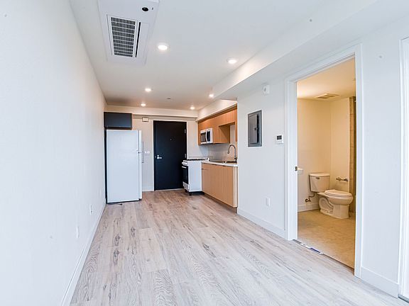 The studio includes brand-new appliances, air conditioning and heating, durable high-quality flooring, a contemporary kitchen with ample storage, and generous natural light. The building offers secure, controlled access, and convenient on-site laundry facilities.
