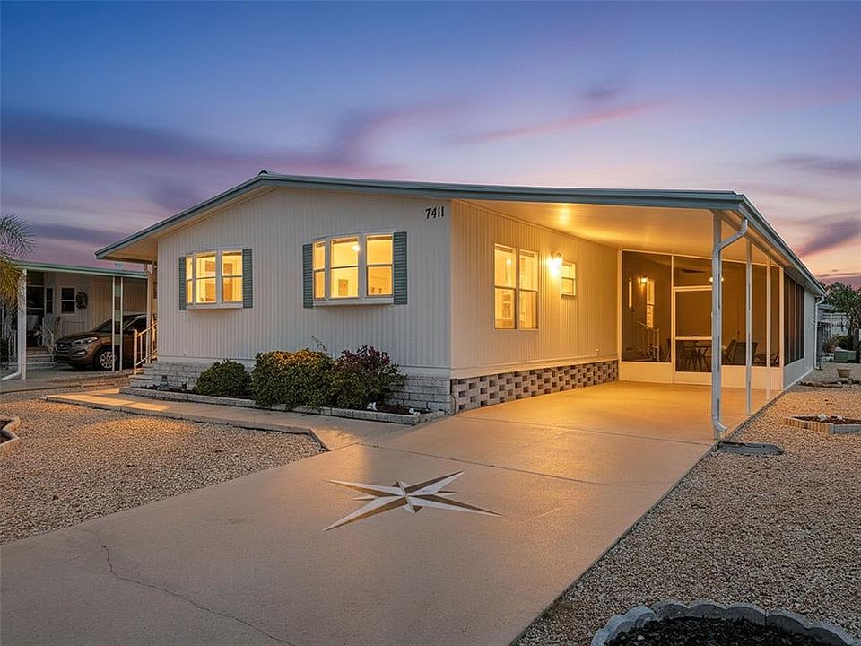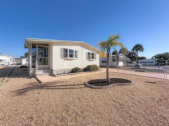 This is it! The perfect 55+ community on Florida's West Coast! Ponderosa Park features the ultimate in easy, care-free living. Great location near shopping, restaurants, and a short drive to the warm tropical Gulf waters. With HOA fees of only $250 per year, enjoy Bocci Ball, Events at the Clubhouse, and relax Poolside year round. Perfect for Snowbird or year round Resident. This incredible home is a value-packed 2 bedroom, 2 full bathroom layout with lots of living space set up in open floor plan. Large Primary Bedroom has en-suite bath with walk-in closet. Kitchen is in the center, making entertaining easy. 2 sets of sliding glass doors add an airy feel, laminate flooring is easy care and beautiful. Everything is well maintained, with pride of ownership showing in extra attention to detail. Large Enclosed Utility room houses extra fridge and laundry facility with loads of extra storage, PLUS a great workshop area!! Everything outside is easy to maintain, and fresh paint reflects the owners' exceptional commitment. And now, best of all, you only need your toothbrush, because this home is fully furnished and equipped as you see in the photos!! Down to the dishes and linens and towels!! What an amazing opportunity and an exceptional value!
