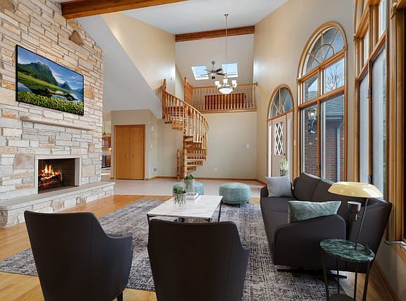 Don't miss this quality-built 3-step ranch home in Brookside Glen! The inviting entry leads into the dramatic lofted living area with floor to ceiling dual-sided Colorado Flagstone fireplace, gorgeous hardwoods, and spiral staircase to the bonus loft. Prepare meals in the chef's kitchen featuring custom cabinetry, oversized island, stainless steel appliances, wine fridge, and warm natural light through large skylight. Entertain with ease in an additional family room off the kitchen with access to the side patio. Retreat at day's end to the elegant owner's suite with tray ceiling, walk-in closet, spa inspired ensuite with dual sinks, jetted tub, and skylight. Two additional spacious bedrooms each with walk-in closets, a full bath, and laundry complete the main level. The unfinished basement provides great storage, full bathroom, stone fireplace, and even more potential living space. An oasis awaits with a spacious patio overlooking the above ground pool and prime corner lot. Improvements include a new roof 2017 and A/C 2021. Great location in Lincoln Way East school district, close to shopping, dining, parks, train station and easy interstate access. A preferred lender offers a reduced interest rate for this listing.
