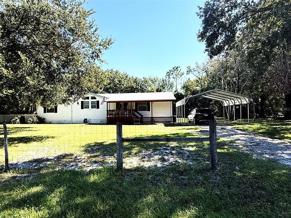 COUNTRY LIVING, NO FLOOD ZONE AND NO HOA! This stunning 3-bedroom, 2-bathroom unit is the perfect blend of modern charm and convenient living. With a spacious 1960 sq.ft. of floorspace, this detached home offers ample room for your family to grow and thrive. Situated on a desirable 1-acre corner lot, this property boasts a fenced yard, providing privacy and security for you and your loved ones. The metal roof ensures durability and longevity, while the absence of a flood zone offers peace of mind during rainy seasons. Parking will never be an issue with the convenience of 2 parking spaces and a 2-car carport. Need extra storage space or a workshop? Look no further! This property features a 16' x 24' workshop with electric, perfect for all your DIY projects and hobbies. Step inside to discover a beautifully remodeled interior. The large open kitchen is a chef's dream, featuring white cabinets that provide ample storage space for all your culinary needs. The 14' x 20' Florida room offers versatility as an additional living area or entertainment space. Conveniently located just 1.6 miles from the Wesley Chapel Recreation Complex, Cricket Stadium and Park, and the new (being built) John Hopkins Children's Hospital just 5 minutes away. You'll have easy access to recreational activities for the whole family to enjoy. Schools are only about 2 miles away. Don't miss out on this fantastic opportunity! Take advantage of the zoning classification AR (Agricultural) and create your own oasis in this desirable Wesley Chapel location. Metal roof 2021 and secondary roof Sept. 2024, AC 2018.