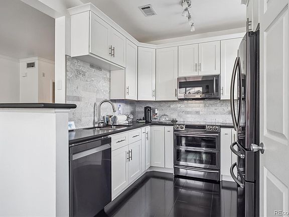 Step inside to a light-filled open floor plan with soaring ceilings, elegant crown molding, and premium laminate flooring enhanced with dual vapor and sound barriers for long-lasting beauty and quiet living. The fully remodeled kitchen is a standout, featuring matte black granite countertops, designer soft-close cabinetry with slide-outs, a Carrara tile backsplash, and striking black stainless appliances—including a double oven range and convection microwave.