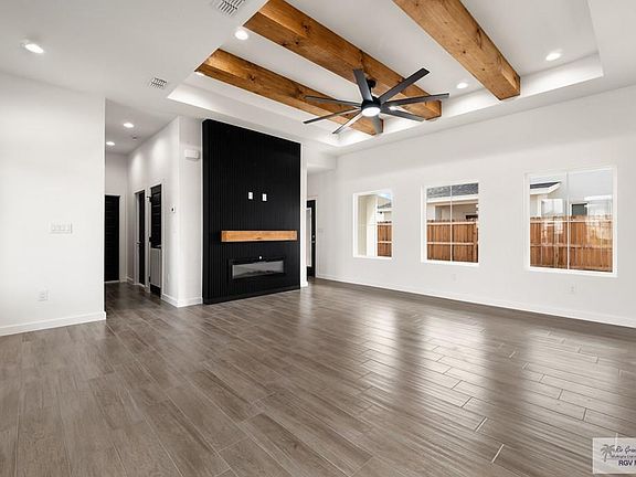 Welcome to this stunning new construction located in North Brownsville, zoned to the highly desired Los Fresnos ISD. This modern rustic farmhouse offers incredible curb appeal with its white, black, and natural wood-beam exterior, nestled on a quiet cul-de-sac. Inside, you'll find an open concept layout, all plank tile floors, recessed lighting, and beautiful wood beams throughout. The kitchen features custom cabinetry, gold finishes with black trim, and a seamless flow into the living area—perfect for entertaining. The primary suite includes a double vanity, double shower heads, garden tub, private commode, and a built-in vanity. Additional highlights include an indoor laundry room, mud room, fully fenced backyard, and grass installed front and back. A perfect blend of modern design and farmhouse charm!